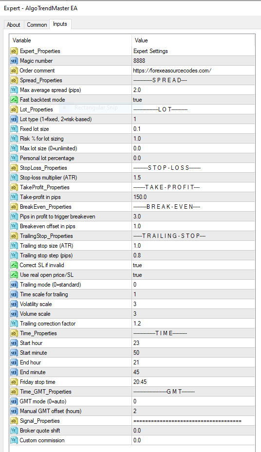 - Customize: Adjust settings like lot size, risk percentage, stop-loss, take-profit, and trading hours in the EA’s input parameters.