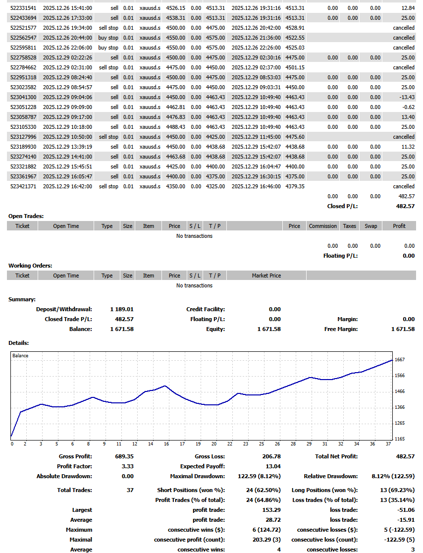 Once a trade is active, the EA manages open positions by canceling opposing pending orders to avoid conflicting trades, maintaining a focused strategy. The system supports optional take-profit levels. All trades are uniquely identified to track performance and ensure proper management within the XAUUSD market.